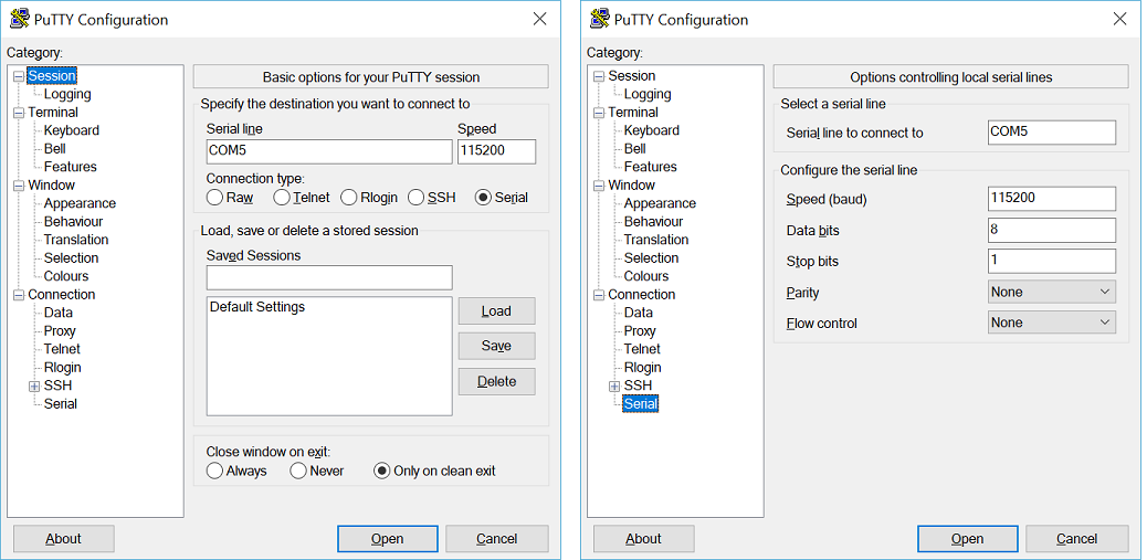Conecta el puerto de Serie USB al ordenador y configura Putty con los parámetros que se muestran en la imagen: