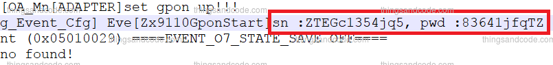 Busca la línea que se muestra en la imagen, donde aparece el Número de Serie del ONT y la contraseña de la conexión de fibra óptica.