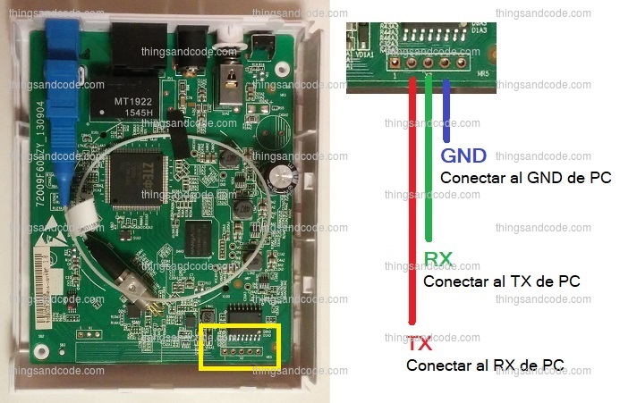 En la siguiente imagen tienes la posición del puerto de serie interno del ONT ZTE F601. Conecta los cables con el dispositivo apagado como indico en el esquema.