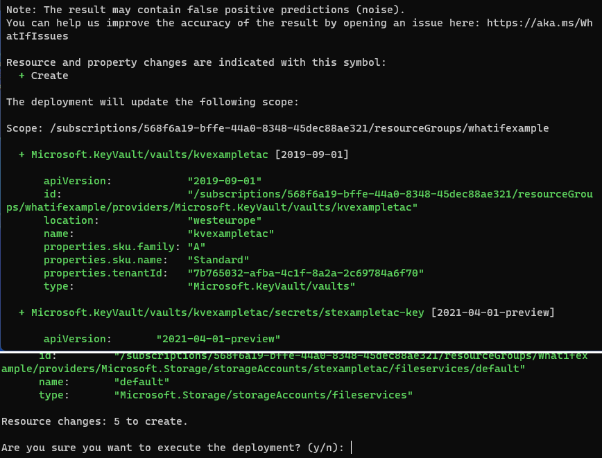 The important part is the parameter ‘–confirm-with-what-if’ that executes what-if before the deployment. The rest of the code is the same as a normal deployment.