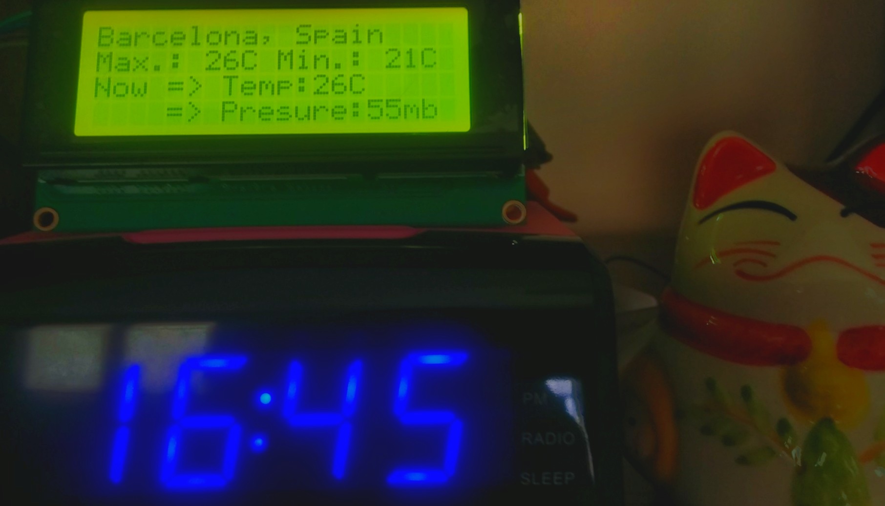 He juntado el código de las llamadas a Yahoo Weather y el del controlador LCD para construir una pantalla que me muestre el tiempo y la he colocado encima de mi despertador, así cuando me levante sabré si tengo que abrigarme o no.