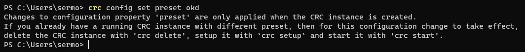 crc config set preset okdto switch to CodeReady Containers for OKD.