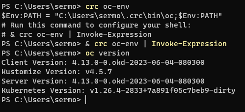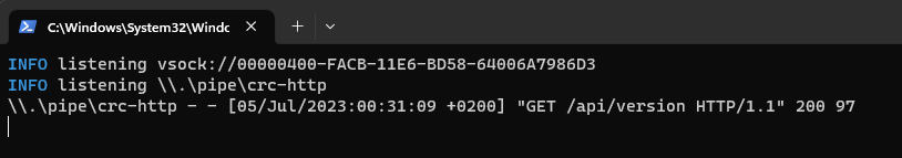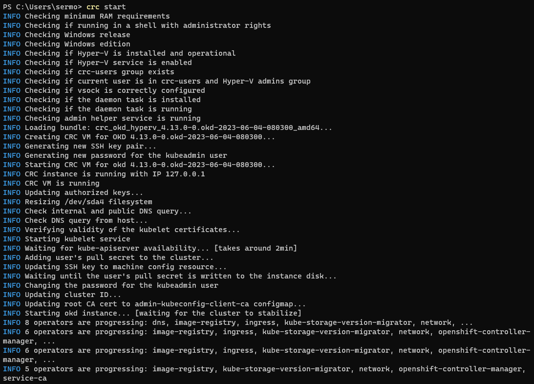 IMPORTANT: The process will open a terminal of crc daemon that acts as a middleware between crc and the Openshift Local cluster. Don’t close the window because it will stop the daemon too. In case you closed it, run