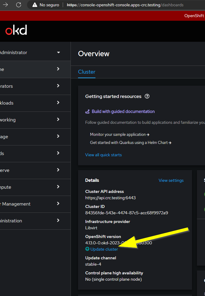 To upgrade the version of the Openshift Local cluster login to the web console as kubeadmin and click in the Update cluster link of the details section.